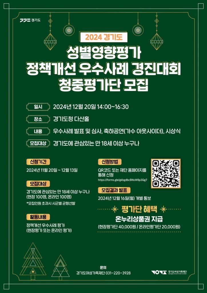 경기도가 ‘2024년 성별영향평가 정책개선 우수사례 경진대회’에서 우수 정책개선 사례를 평가할 청중평가단 200명을 다음 달 13일까지 모집한다고 25일 밝혔다.