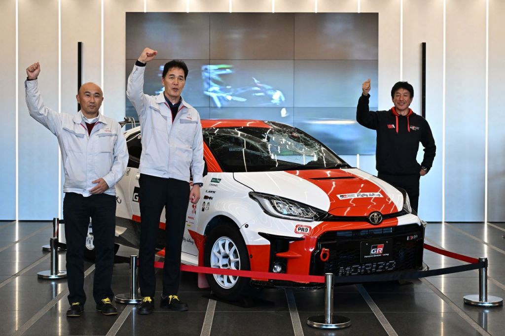 도요타 처완기능양성부 테스트 드라이버인 도요오카 사토시 부장(사진 맨 오른쪽)과 야부키 히사시 주사(가운데), 그리고 야하기 마사히코 토요타 테크니컬센터 R&D 지원 주사가 도요타 고성능 차량 앞에서 기념 촬영을 하고 있다. 도요타 공동 취재단 제공