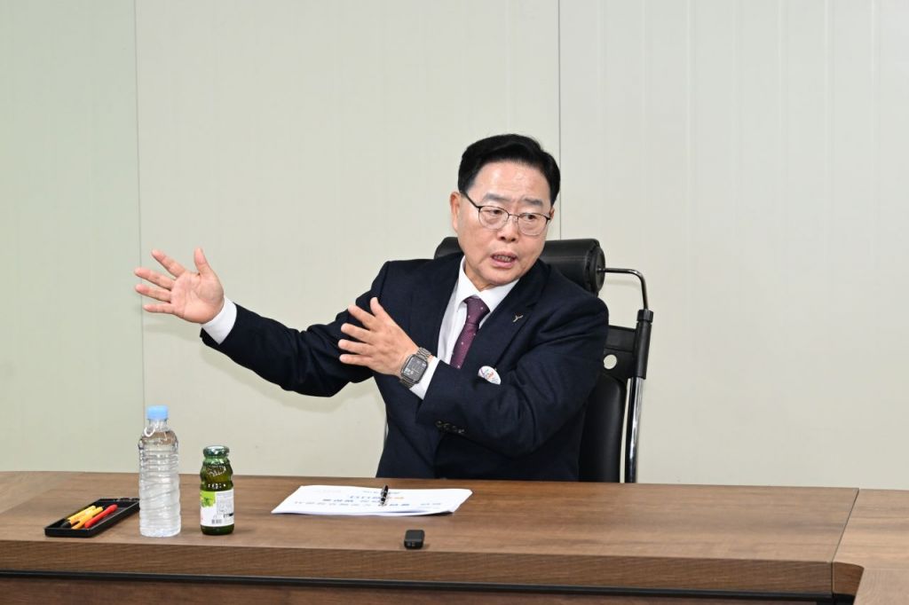 강수현 양주시장이 김정민 부시장, 간부 공무원 등이 참석한 가운데 최근 개통한 지방도375호선(은현~봉암) 도로 확포장 공사 건설현장사무소에서 간부회의를 개최하고 있다. 양주시 제공