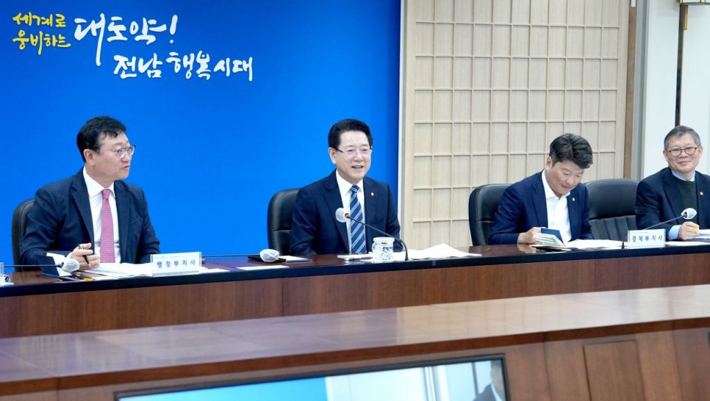 김영록 전라남도지사가 26일 오전 도청 서재필실에서 실국장 정책회의를 주재하고 있다. 전남도 제공