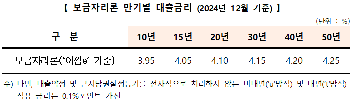 이에 ‘아낌e-보금자리론’ 기준으로 연 3.95(10년)∼4.25%(50년)가 적용되고 저소득청년, 신혼가구, 사회적배려층(장애인·한부모 가정 등)과 전세사기피해자 등이 추가 우대금리(최대 1.0% 포인트)를 적용받을 경우, 최저 연 2.95(10년)∼3.25%(50년) 금리가 적용된다.