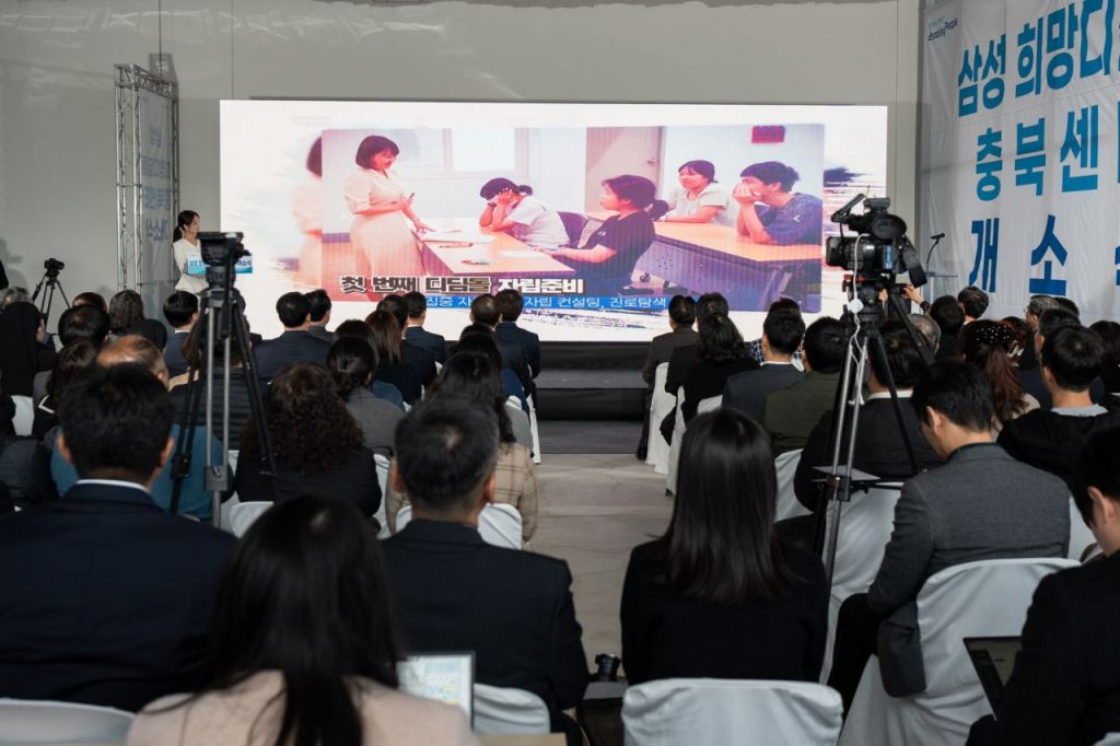 충북 청주시에서 26일 열린 삼성희망디딤돌 충북센터 개소 행사 참석자들이 희망디딤돌 사업 소개 영상을 시청하고 있다. 사진=삼성전자 제공