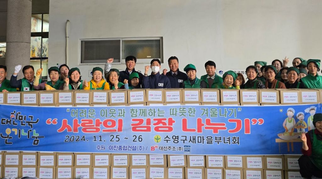 사랑의 김장 나누기 행사는 수영구 새마을부녀회 주관으로 25∼26일 양일간 진행됐으며 행사를 통해 마련된 김치 1000포기는 수영구 소외 이웃 300가구에 전달된다.