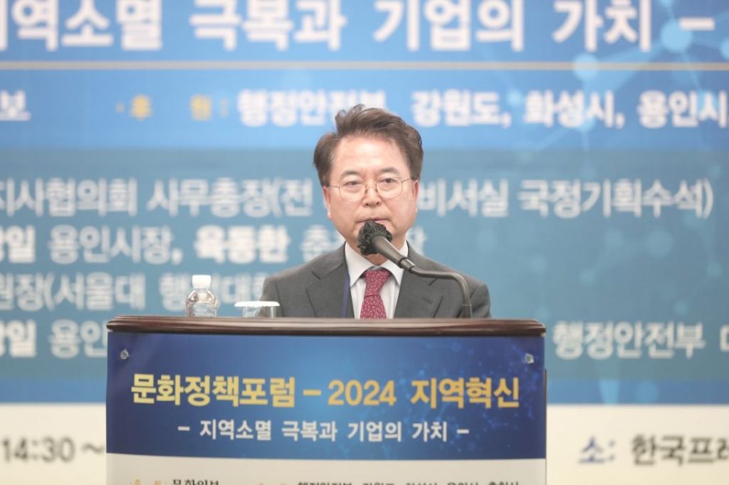 육동한 춘천시장이 26일 서울 한국프레스센터에서 ‘지역소멸 극복과 기업의 가치’를 주제로 열린 ‘문화정책포럼-2024 지역혁신’에서 ‘지역소멸시대, 춘천의 비책’을 주제로 발표했다. 사진=춘천시청 제공