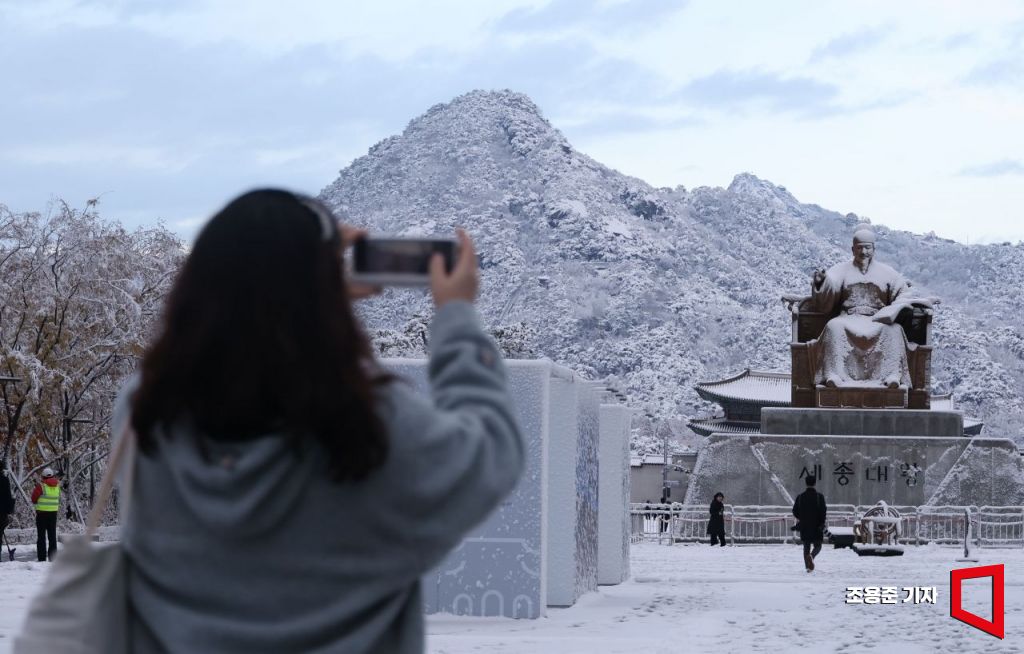 서울 전역에 많은 눈이 내린 27일 서울 종로구 북악산이 하얗게 내린 눈으로 덮히자 출근길 직장인이 휴대폰에 풍경을 담고 있다.