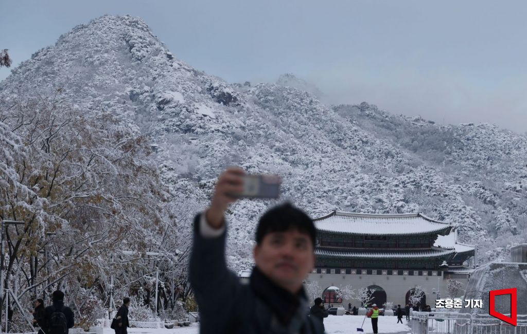 서울 전역에 많은 눈이 내린 27일 서울 종로구 경복궁과 북악산이 하얗게 내린 눈으로 덮히자 직장인들이 휴대폰에 풍경을 담고 있다.