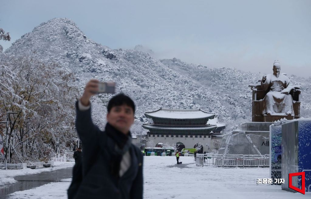 서울 전역에 많은 눈이 내린 27일 서울 종로구 경복궁과 북악산이 하얗게 내린 눈으로 덮히자 직장인들이 휴대폰에 풍경을 담고 있다.