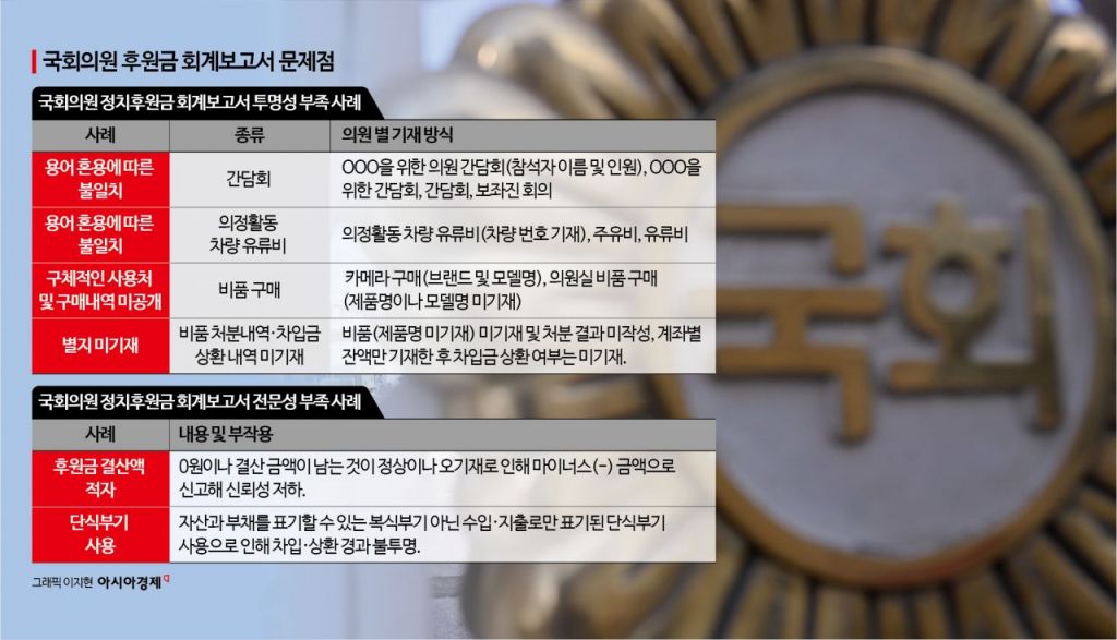 국회의원들의 정치후원금 회계보고서가 의원실마다 유사한 지출 사안을 제각각 다른 방식으로 기재하거나 회계보고서를 오기재해 선거관리위원회에 신고하는 등 통일성과 전문성이 떨어지는 사례가 다수 있는 것으로 파악됐다. 그뿐만 아니라 공개 기간이 6개월로 짧고, 중앙선관위 사무소에 찾아가거나 사본을 받게 돼 있어 감시가 쉽지 않다는 지적이 나온다.