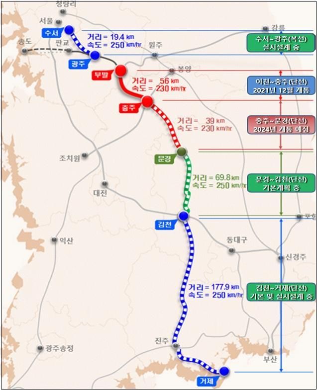 또한 현재 실시설계 중인 수서~광주선(복복선 19.4㎞), 타당성조사 및 기본계획 수립중인 문경~김천선(69.8㎞), 기본 및 실시설계중인 남부내륙철도(김천~거제, 177.9㎞) 사업이 마무리되면 수서에서 문경, 상주, 김천을 거쳐 거제까지 남북 중심지를 종단하는 내륙 간선철도망의 한 축으로 거듭나게 될 전망이다.