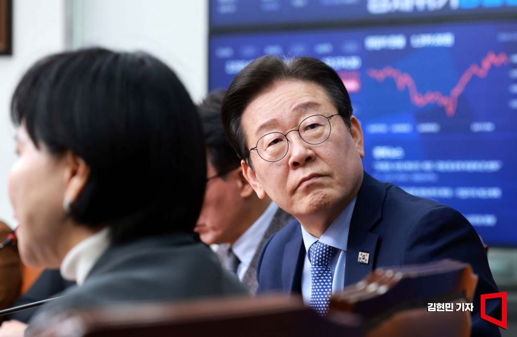 이재명 더불어민주당 대표가 27일 국회에서 열린 최고위원회의에서 전현희 최고위원의 발언 중 자료화면을 바라보고 있다.
