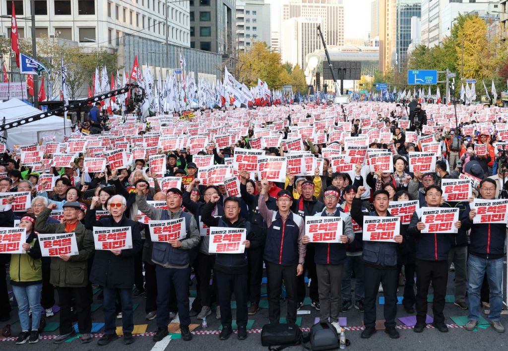 9일 오후 서울 숭례문 일대에서 열린 민주노총 전태일열사 정신계승 2024 전국노동자대회·1차 퇴진 총궐기에서 민주노총 조합원들이 구호를 외치고 있다. 연합뉴스