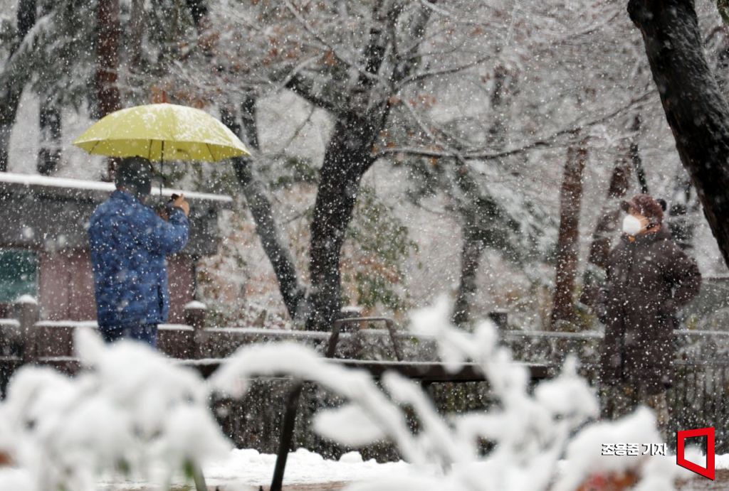 서울을 비롯해 전국적으로 많은양의 눈이 내리고 있는 27일 서울 강남구 삼성동 선정릉을 찾은 사람들이 기념사진을 찍고 있다.