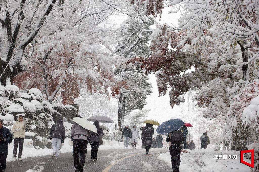 서울에 20cm에 이르는 폭설이 내린 27일 서울 중구 남산을 찾은 시민을 비롯한 관광객들이 눈길을 걸으며 겨울풍경을 만끽하고 있다.