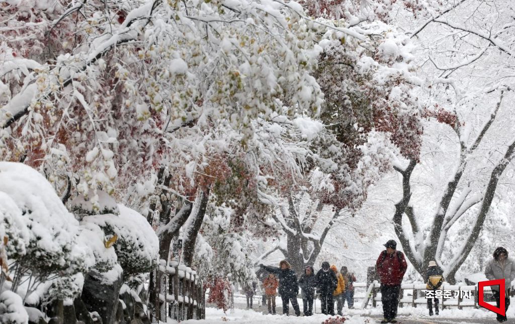 서울에 20cm에 이르는 폭설이 내린 27일 서울 중구 남산을 찾은 시민을 비롯한 관광객들이 눈길을 걸으며 겨울풍경을 만끽하고 있다.