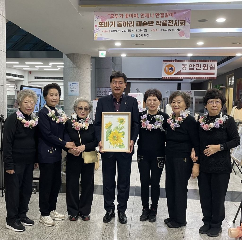 방세환 광주시장(가운데)가 65세 이상 어르신의 자율적 건강동아리 ‘또바기’와 특별한 미술작품 전시회를 개최한 뒤 기념촬영을 하고 있다. 경기 광주시 제공