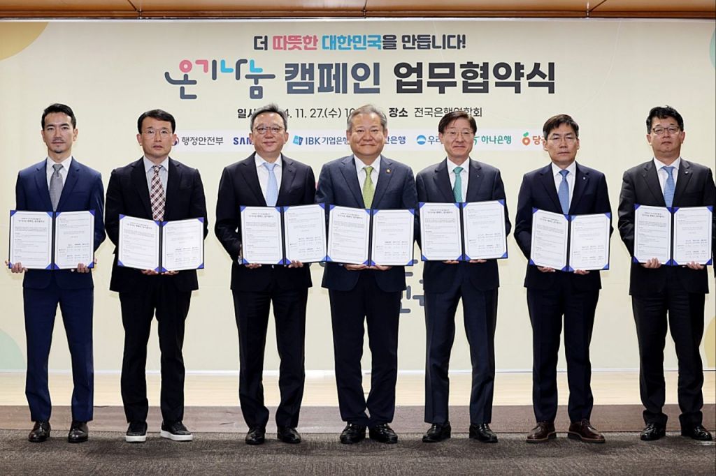 우리은행은 행정안전부와 우리 사회의 나눔 문화 확산을 위한 ‘온기나눔 캠페인’ 협약을 체결했다고 27일 밝혔다. 온기나눔 캠페인은 우리 주변의 힘들고 어려운 이웃을 위한 봉사와 나눔 분위기를 조성하고 이를 범국민적으로 확산하기 위해 행정안전부에서 주관하는 캠페인이다.
