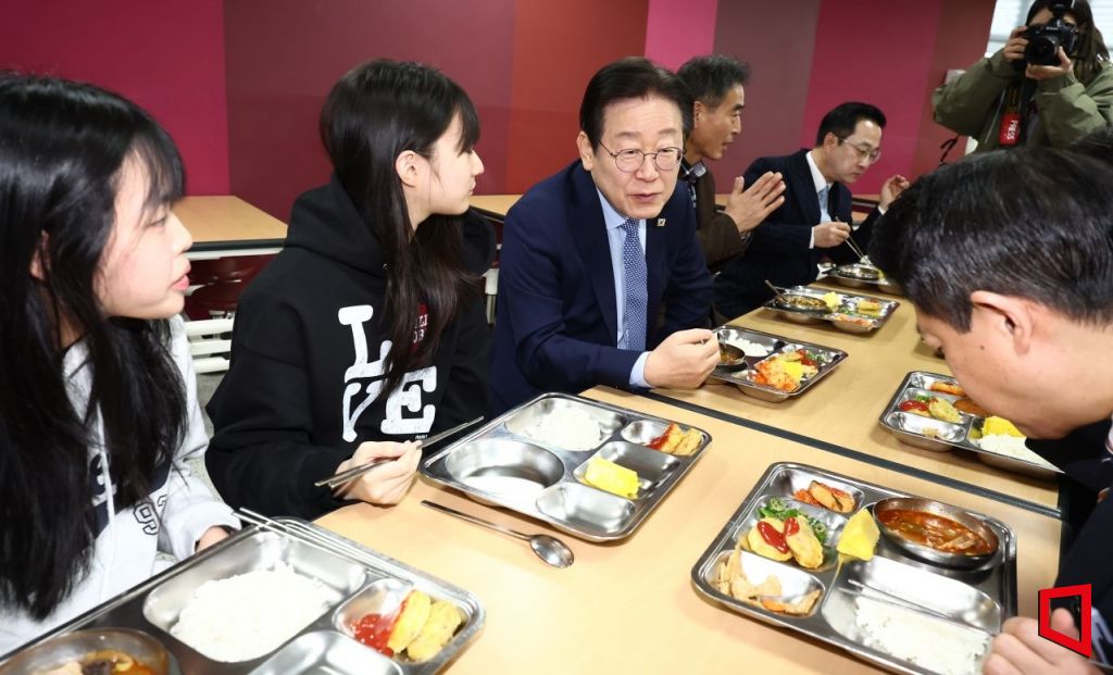 이재명 더불어민주당 대표가 27일 서울 성동구 금호고등학교에서 열린 고교 무상교육을 위한 현장 간담회를 마친 뒤 식생활 교육실에서 학생들과 대화하고 있다. 국회사진기자단
