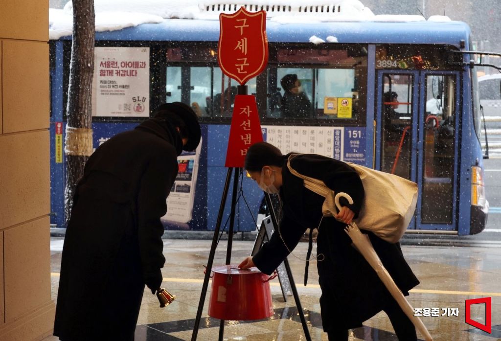 구세군 자선냄비 거리모금 활동이 본격 시작된 27일 서울 명동 롯데백화점 앞에서 시민이 자선냄비에 성금을 내고 있다. 이날부터 내달 31일까지 전국 316여 곳에서 모금활동이 진행된다.