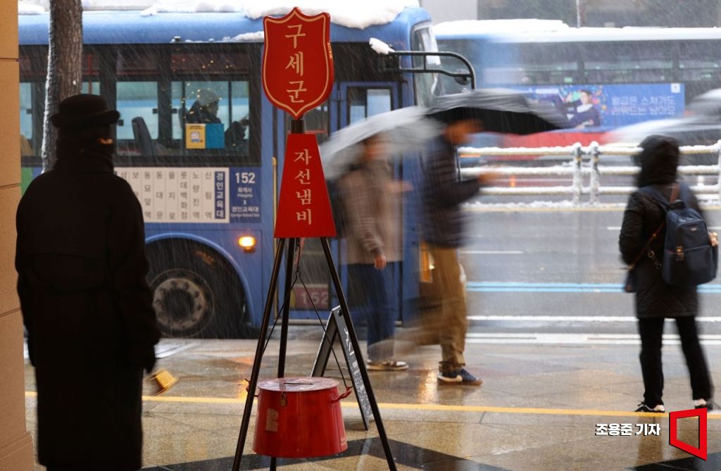 구세군 자선냄비 거리모금 활동이 본격 시작된 27일 서울 명동 롯데백화점 앞에서 구세군이 종을 울리며 모금활동을 하고 있다. 이날부터 내달 31일까지 전국 316여 곳에서 모금활동이 진행된다.