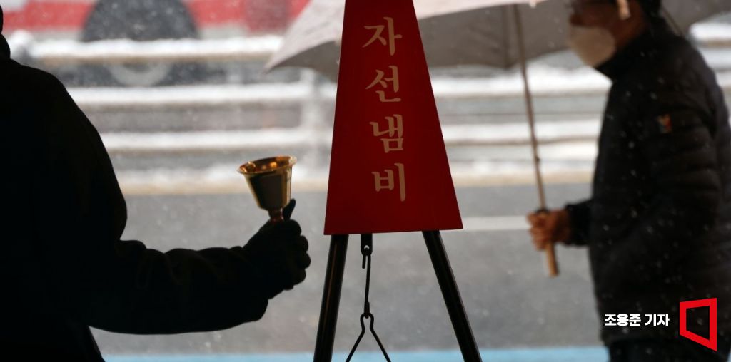 구세군 자선냄비 거리모금 활동이 본격 시작된 27일 서울 명동 롯데백화점 앞에서 구세군이 종을 울리며 모금활동을 하고 있다. 이날부터 내달 31일까지 전국 316여 곳에서 모금활동이 진행된다.