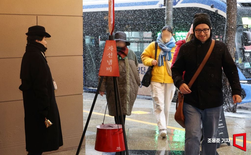구세군 자선냄비 거리모금 활동이 본격 시작된 27일 서울 명동 롯데백화점 앞에서 구세군이 종을 울리며 모금활동을 하고 있다. 이날부터 내달 31일까지 전국 316여 곳에서 모금활동이 진행된다.