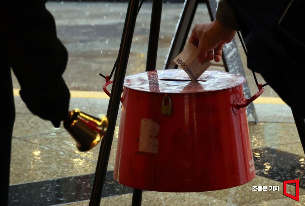 구세군 자선냄비 거리모금 활동이 본격 시작된 27일 서울 명동 롯데백화점 앞에서 시민이 자선냄비에 성금을 내고 있다. 이날부터 내달 31일까지 전국 316여 곳에서 모금활동이 진행된다.