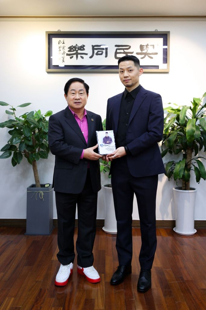 주광덕 남양주시장(왼쪽)이 27일 가수 가오가이를 새로운 시 홍보대사로 위촉한 뒤 기념촬영을 하고 있다. 남양주시 제공