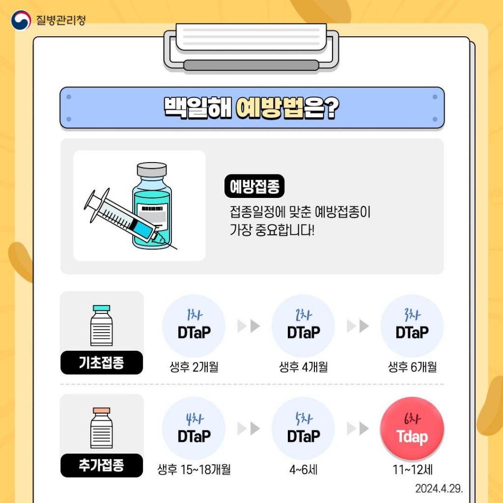 또 백일해 예방을 위해서는 생후 2개월∼만 6세 어린이 예방접종은 어린이 표준 국가 예방접종 일정에 따라 1∼5차까지 DTaP(디프테리아, 파상풍, 백일해) 백신 접종을 하고, 이후 만 11∼12세에 DTaP(디프테리아, 파상풍, 백일해) 백신 추가접종을 시행해야 한다.