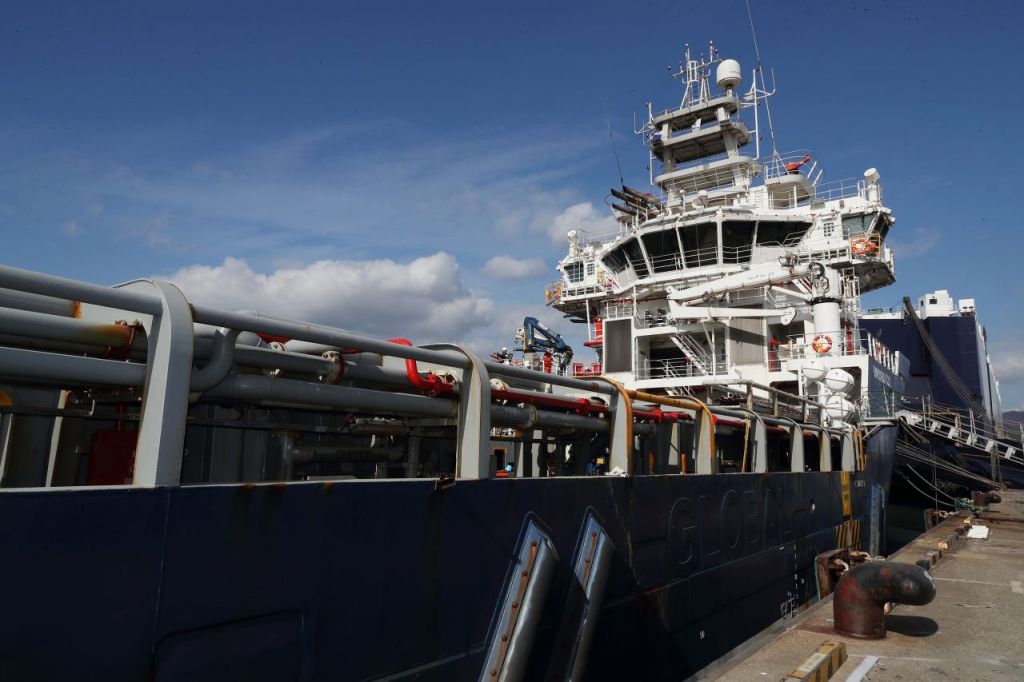 부산신항 다목적터미널 내 정박 중인 보급선 BEN NEVIS(길이 약 80m). 한국석유공사 제공