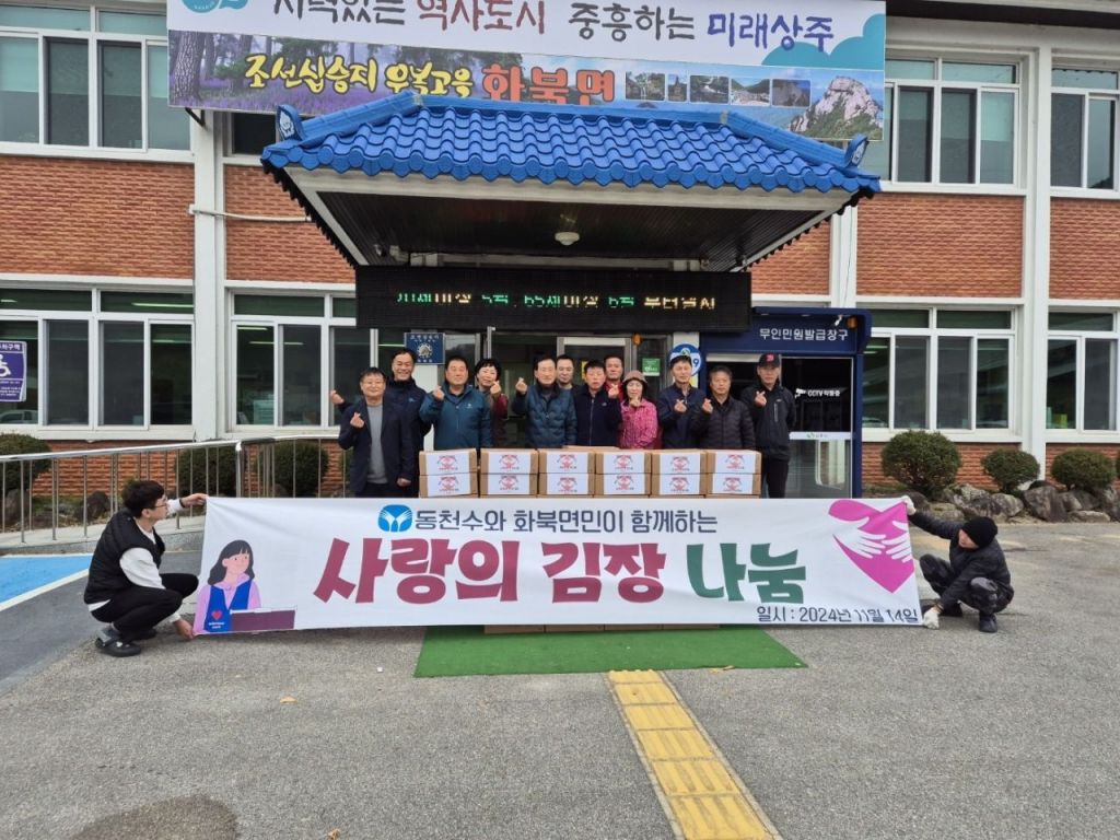 동아쏘시오그룹의 생수·음료 제조 계열사 동천수는 지난 14일 본사가 위치한 경상북도 상주시 화북면 주요 관공서 및 12개 마을과 '사랑의 김장 나눔 행사'를 실시했다. 김장 나눔 행사는 동천수가 2017년부터 8년간 지속하고 있는 사회공헌활동 중 하나다. 매년 직원 20여명이 참석해 김장김치를 만들어 화북면 마을과 지역 내 취약 계층, 상주 지역 복지관 등에 온정을 나누는 대표 행사로 자리매김하고 있다.