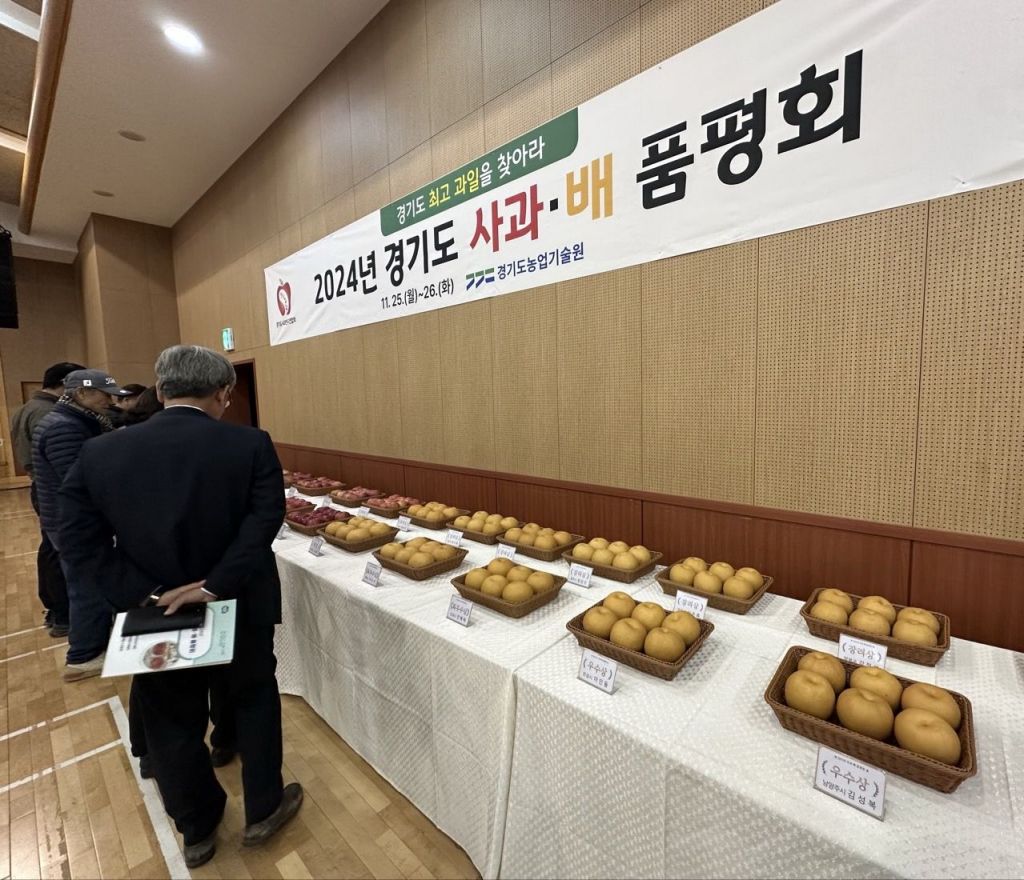 지난 26일 경기도농업기술원에서 개최된 경기 농산물 사과·배 품평회’에서 뛰어난 품질의 농산물을 선보이고 있다. 양평군 제공