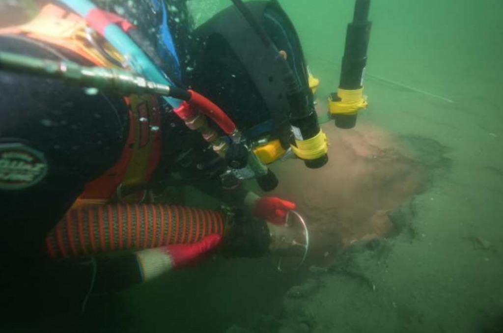 흡입펌프로 해저를 제토 중인 잠수사[사진=국가유산청 제공]