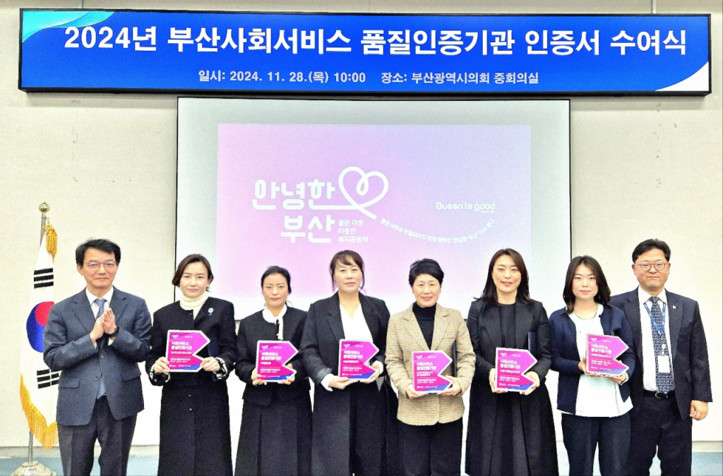 인증현판과 인증서 교부식은 지난 28일 오전 10시 시의회 2층 중회의실에서 배병철 시 사회복지국장, 부산사회서비스원장 등이 참석한 가운데 열렸다.