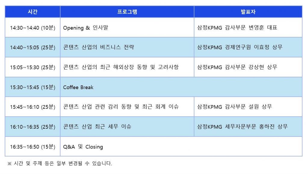 첫 번째 세션에선 이효정 삼정KPMG 경제연구원 상무가 콘텐츠 산업의 비즈니스 전략에 대해 발표한다. 이어 강상현 삼정KPMG 상무가 콘텐츠 산업의 최근 미국 상장 동향 및 고려사항을 전한다. 콘텐츠 산업 관련 감리 동향과 최근 회계 이슈는 설원 삼정KPMG 상무가 설명하고, 홍하진 삼정KPMG 상무가 콘텐츠 산업의 최근 세무 이슈를 짚는다.