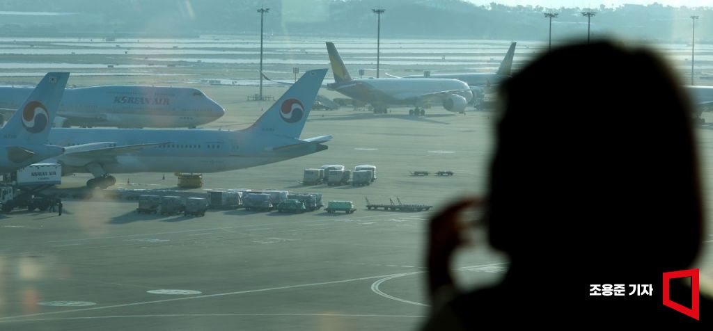 대한항공과 아시아나항공의 기업결합 마지막 관문인 유럽연합 집행위원회(EC)의 최종 승인이 난 가운데 29일 인천 영종도 인천국제공항 활주로와 계류장에 대한항공-아시아나항공 여객기가 대기하고 있다. 지난 2020년부터 시작된 대한항공과 아시아나항공의 합병 작업이 4년 만에 마무리 단계에 들어섰다.