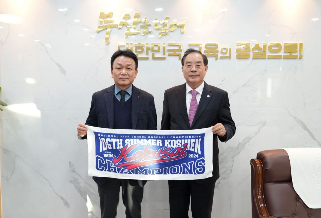 하윤수 교육감이 고시엔 우승 교토국제고 교장과 만나고 있다. 부산시 교육청 제공