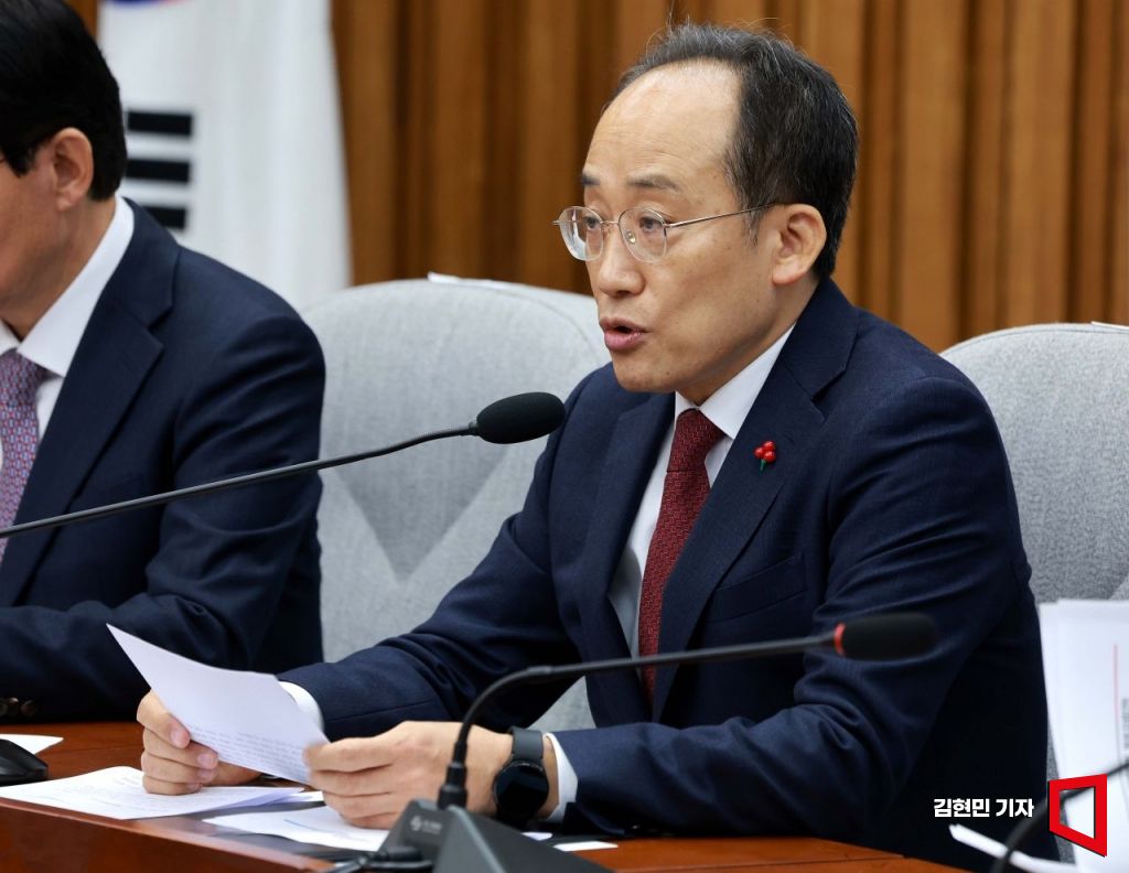 추경호 국민의힘 원내대표가 29일 국회에서 열린 원내대책회의에서 발언하고 있다. 김현민 기자