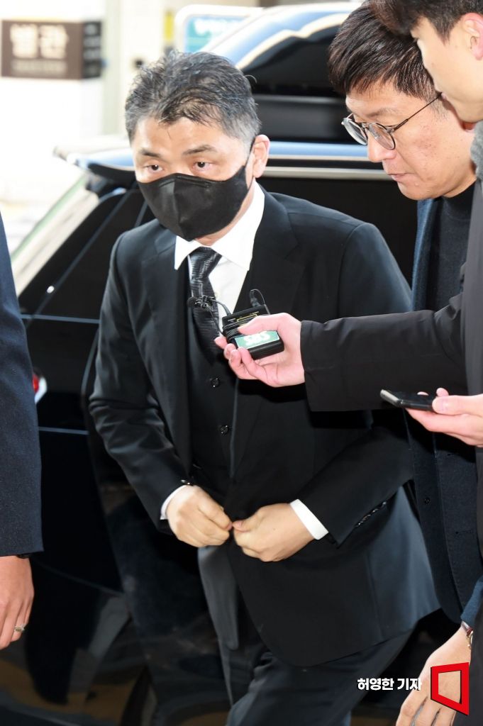 SM엔터테인먼트 시세조종 혐의로 재판을 받는 김범수 카카오 경영쇄신위원장이 29일 서울남부지방법원에서 열린 공판에 출석하기 위해 청사로 들어가고 있다.