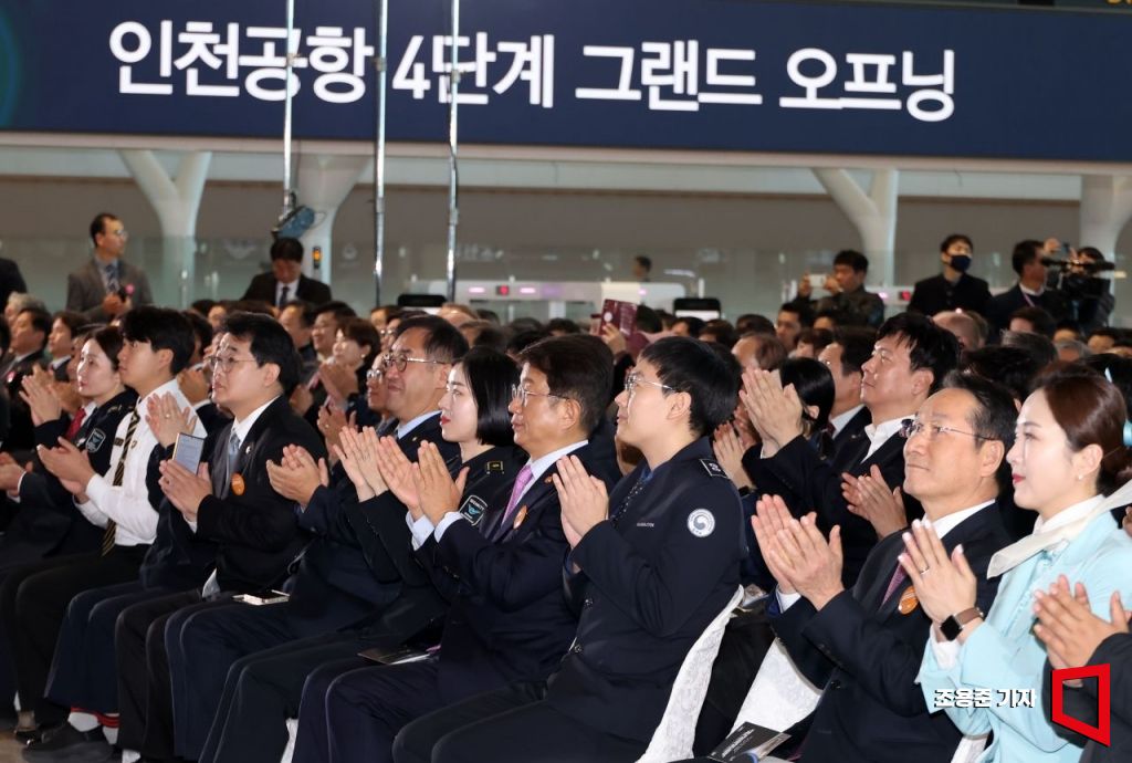 29일 인천 영종도 인천공항제2여객터미널에서 열린 제2여객터미널(T2) 4단계 확장시설 개장식에서 박상우 국토교통부 장관, 유정복 인천시장 등 참석자들이 박수를 치고 있다. 공식운영은 종합시운전 등을 거쳐 내달 3일 시작한다.