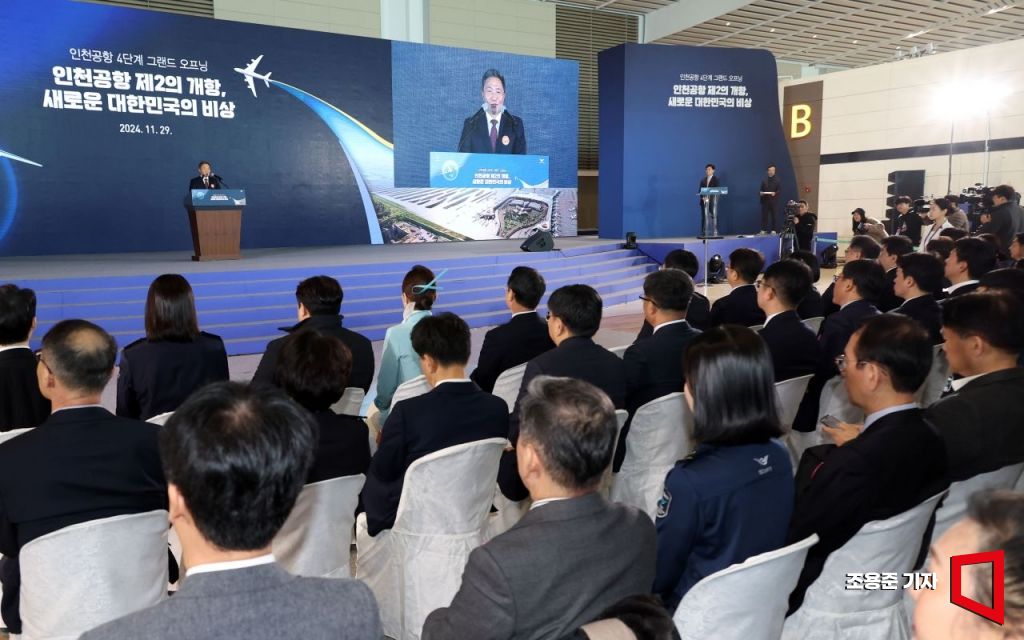 29일 인천 영종도 인천공항제2여객터미널에서 열린 제2여객터미널(T2) 4단계 확장시설 개장식에서 이학재 인천공항공사 사장이 환영사를 하고 있다. 공식운영은 종합시운전 등을 거쳐 내달 3일 시작한다.