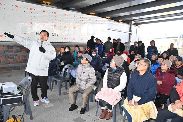 이현재 하남시장이 지난 28일 주민들에게 감이동, 학암동 주민들의 최대 숙원사업인 ‘학암천 정비사업’ 착공에 따른 공사 계획 및 일정 등을 설명하고 있다. 하남시 제공
