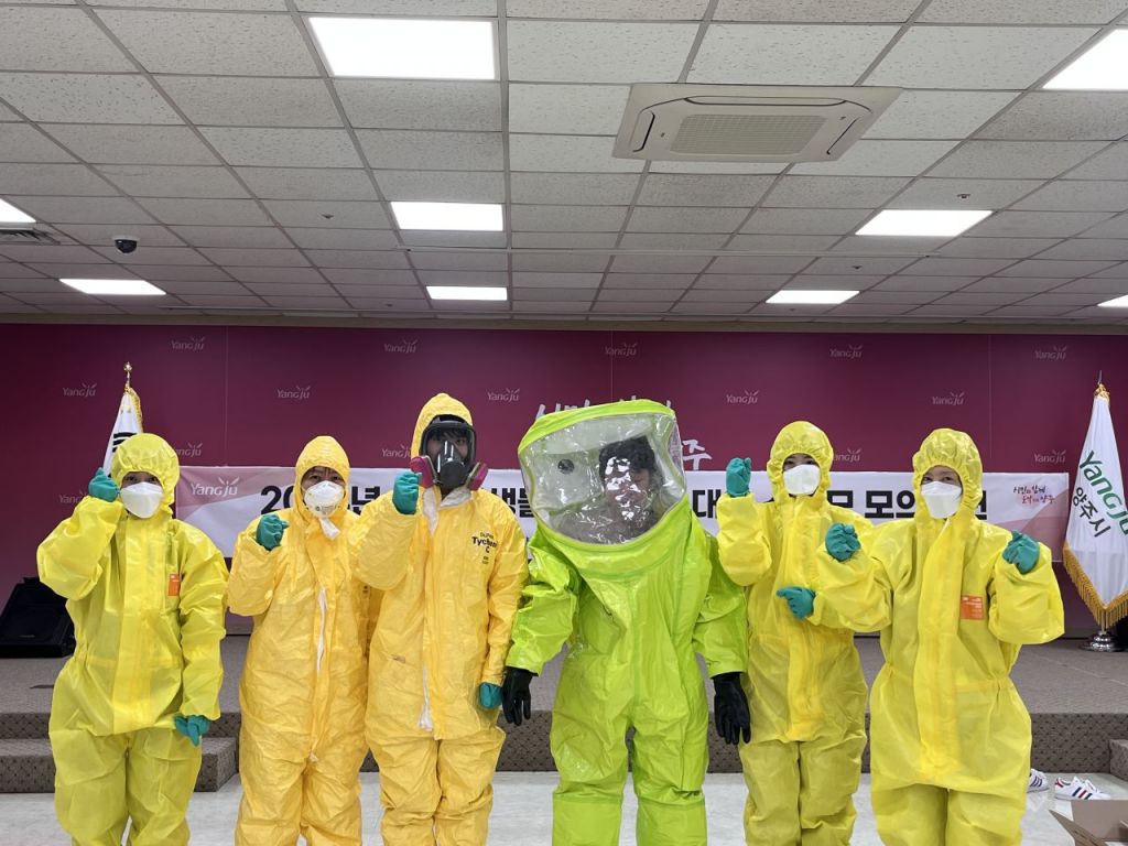 양주시보건소 직원들이 지난 28일 생물테러대비 대응 개인보호구를 감염병대응팀 직원이 착탈의 연습하고 있다. 양주시 제공