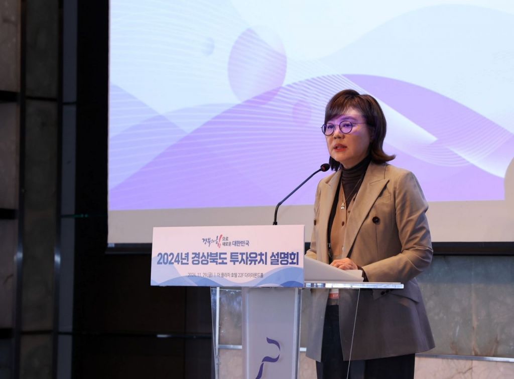 양금희 경북도 경제부지사가 서울에서 열린 '경북도 투자유치 설명회'에서 인사말을 하고 있다.