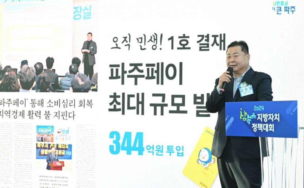 김경일 파주시장은 정책대회에 참석해 정책발표를 통해 파주페이의 전국 최대 규모 발행 배경과 그 성과를 설명했다. 그는 “지역화폐 국비 예산이 대폭 삭감되는 어려움 속에서도, 올해 1호 결재로 파주페이의 대규모 발행을 결정했다”며 “지난해 파주시 전 가구당 지역화폐 20만 원을 지급한 ‘전국 최초 긴급에너지 생활지원금’ 정책을 통해 지역화폐의 지역경제 선순환 효과에 대한 확신이 있었기 때문”이라고 밝혔다.