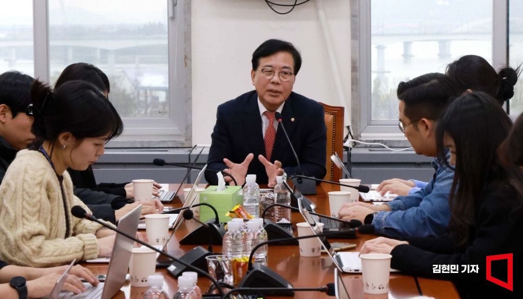 송언석 국회 기획재정위원장이 29일 국회에서 기자들에게 기재위 파행 이유를 설명하고 있다. 이날 기재위는 예산안 관련 세법개정안을 처리할 예정이었다.