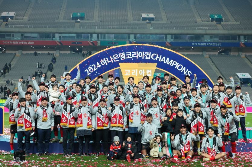 포항스틸러스가 서울월드컵경기장에서 열린 ‘2024 하나은행 코리아컵’ 결승전에서 우승컵을 들어올렸다. 포항시 제공