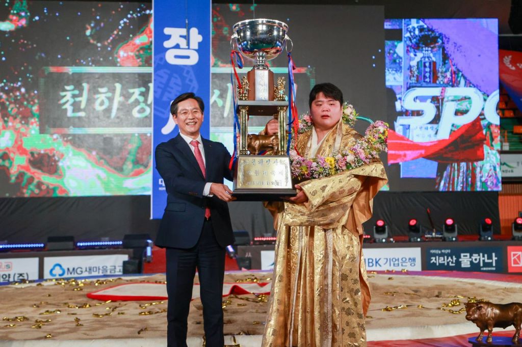 1일 영암실내체육관에서 막을 내린 2024 천하장사 씨름대축제에서 영암민속씨름단 김민재가 천하장사에 등극한 뒤 우승희 영암군수로부터 우승 트로피를 받고 있다. 영암군 제공