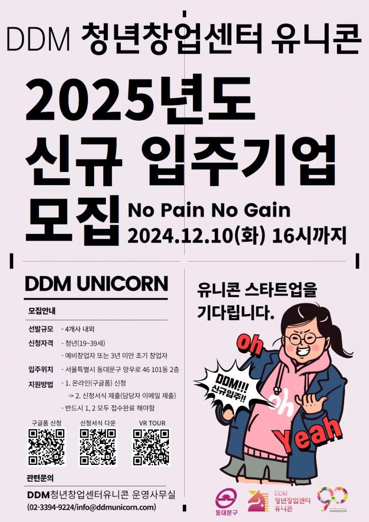 동대문구(구청장 이필형)는 내년도 ‘DDM 청년창업센터 유니콘’에 입주할 신규 청년 창업기업 4개 사를 12월 10일까지 모집한다고 밝혔다.
