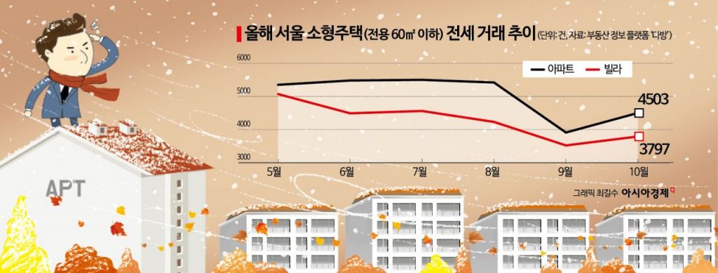 3일 부동산 정보 플랫폼 다방으로부터 받은 ‘서울 소형주택(전용면적 60㎡ 이하) 임대차 거래 현황’에 따르면 올해 10월 현재 기준 아파트 전세는 4503건 거래됐다. 빌라 전세는 3797건이 접수됐다. 아파트 거래량은 빌라를 6개월 연속 앞질렀다. 올해 전체를 놓고 봐도 4월(아파트 4944건, 빌라 5063건)을 제외하고 모두 아파트 전세 거래량이 빌라보다 많았다.