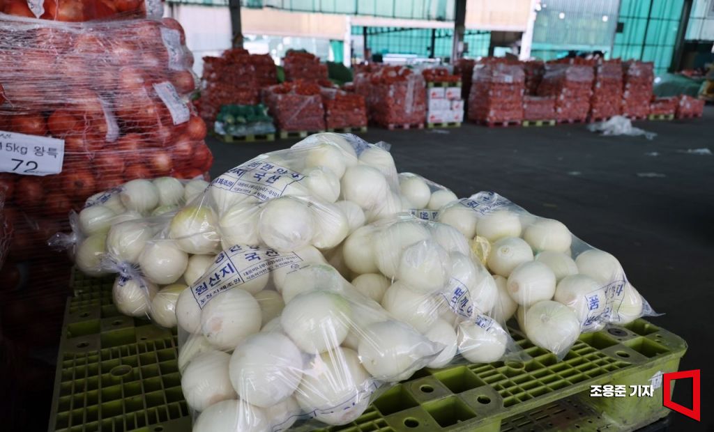 서울 송파구 가락도매시장 채소집하장에 산지에서 올라온 양파가 쌓여 있다. 사진=조용준 기자